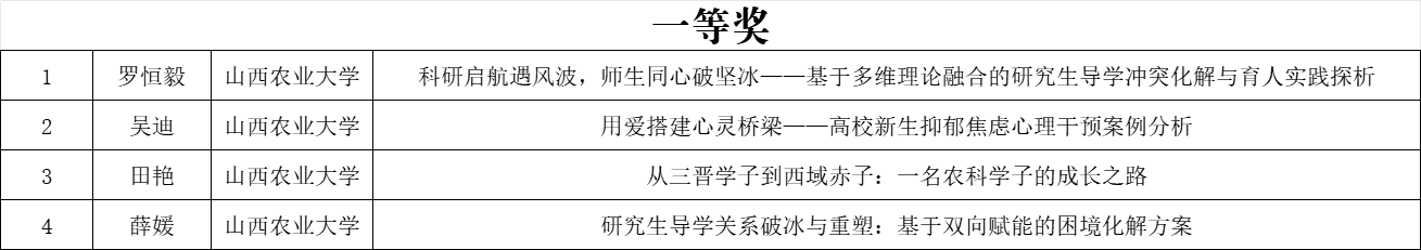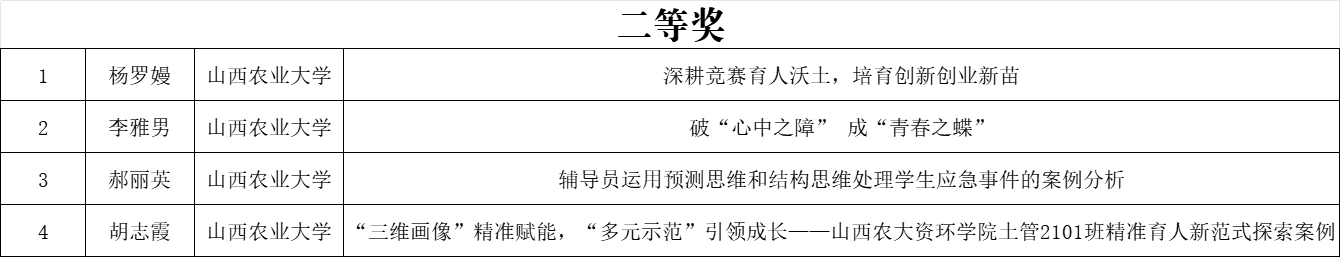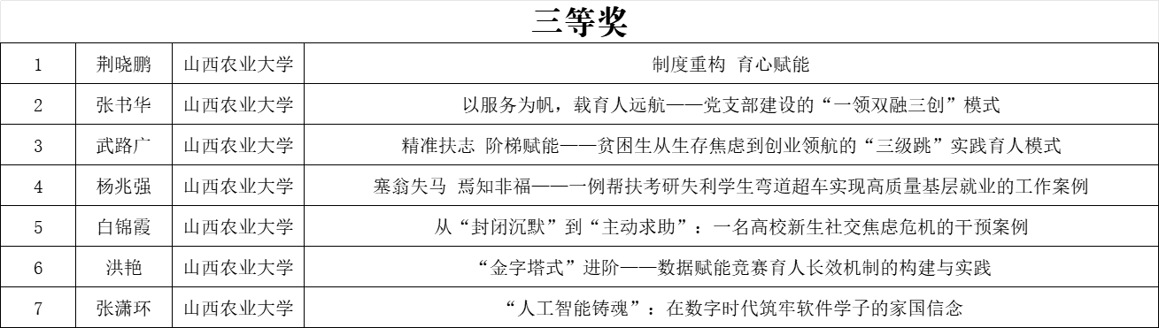 为深入落实《山西省教育厅关于开展高校辅导员队伍建设改革试点的通知》,总结推广学生工作先进经验,全面提升育人实效,推动辅导员队伍专业化、职业化、专家化发展,山西省教育厅决定开展2025年高校辅导员工作优秀案例征集评选活动。经个人申报、省教育厅组织专家评审,共评选出优秀案例446个,其中一等奖64个、二等奖155个、三等奖227个。