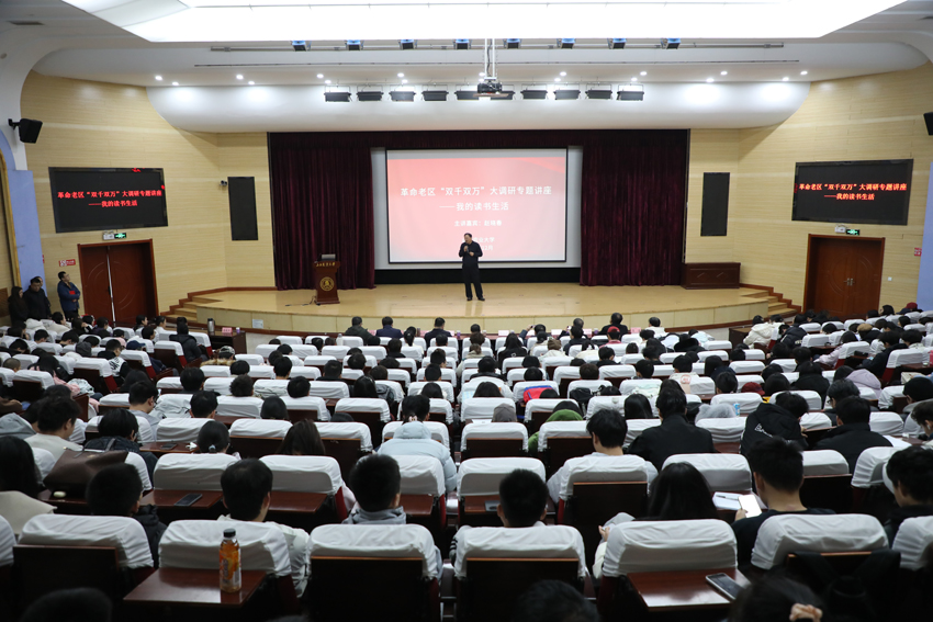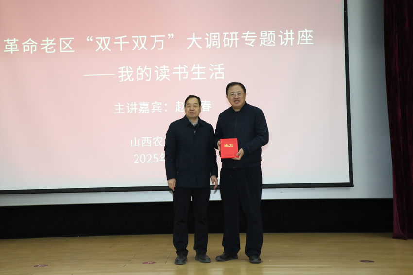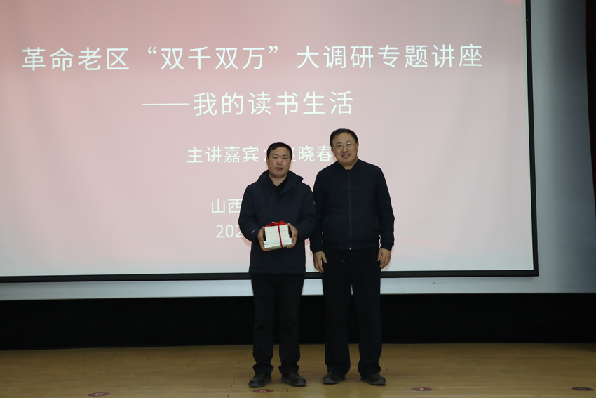 12月9日下午,由学校和山西省老区建设促进会联合举办的“革命老区‘双千双万’大调研专题讲座”在我校太谷校区书林堂举行。山西省广播电视局党组书记、局长,中国作家协会会员、省教育厅高校思想政治理论课特聘教授赵晓春应邀作题为《我的读书生活》的专题报告。省老促会副会长潘云,省老促会副秘书长、老区精神研究委员会主任李卫东,老区精神研究委员会副主任郭虎银,校党委副书记、校(院)长张强出席,校党委副书记李卫祥主持报告会,学校相关部门负责同志、各学院教师代表和学生代表现场聆听。