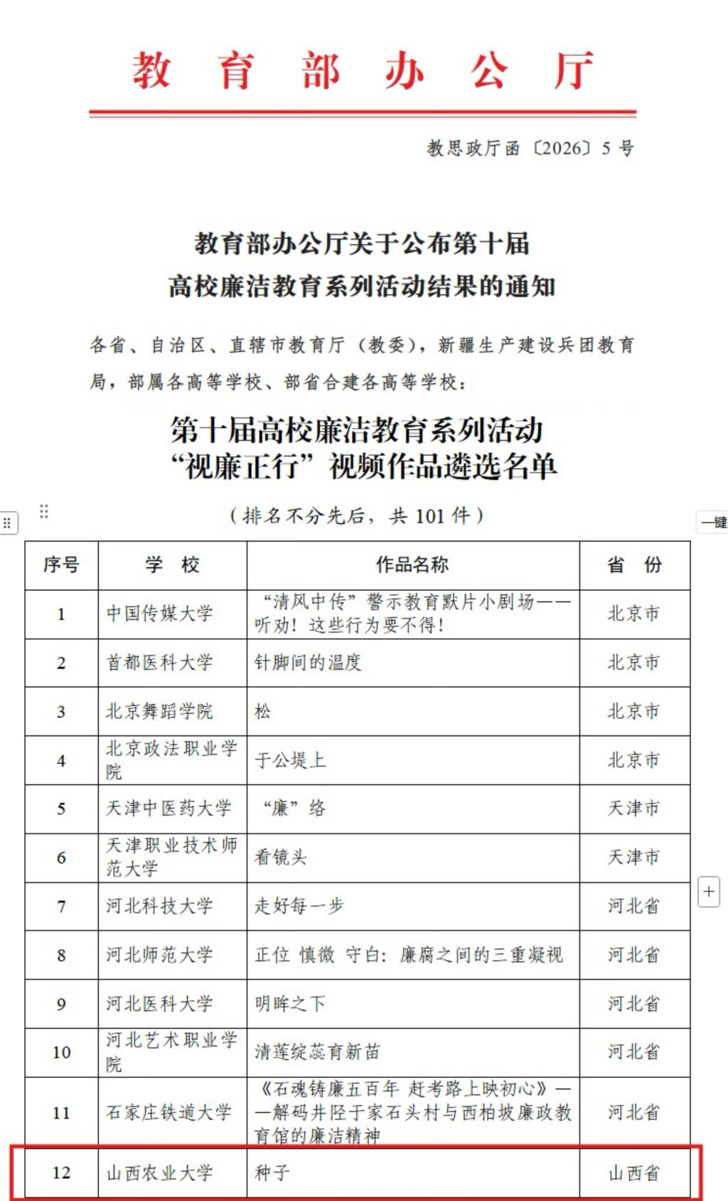 近日,教育部办公厅下发了《关于公布第十届高校廉洁教育系列活动结果的通知》,我校宣传统战部报送的视频作品《种子》进入第十届高校廉洁教育系列活动“视廉正行”视频作品遴选名单。