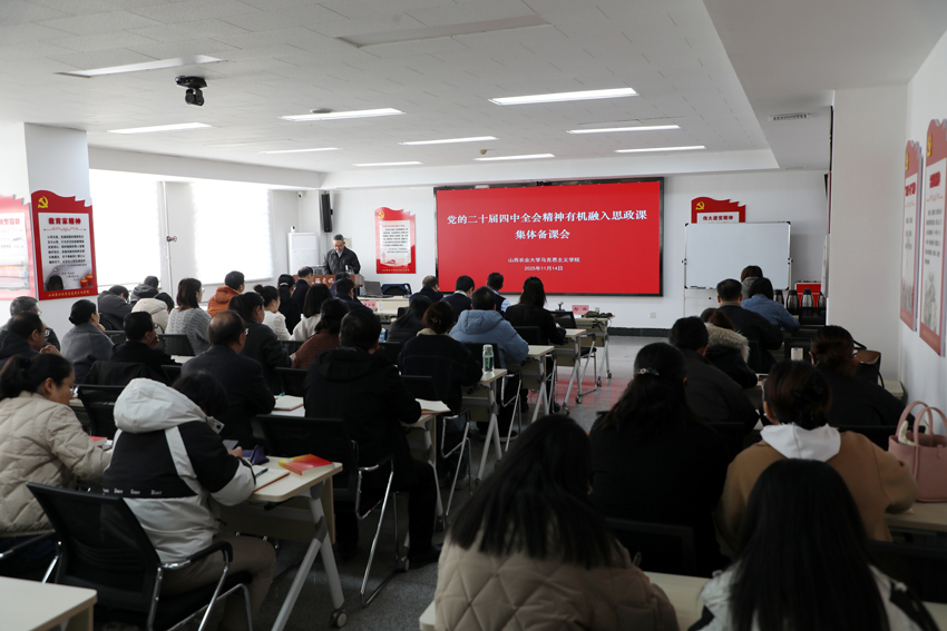山西省委党校丰存斌教授应邀以“确保基本实现社会主义现代化取得决定性进展——学习贯彻党的二十届四中全会精神”为题作专题授课辅导。田云飞、石宇、袁伟业、郝旭燕、宏蕊5位教师分别围绕全会精神融入各门思政课和专题章节内容展开交流。